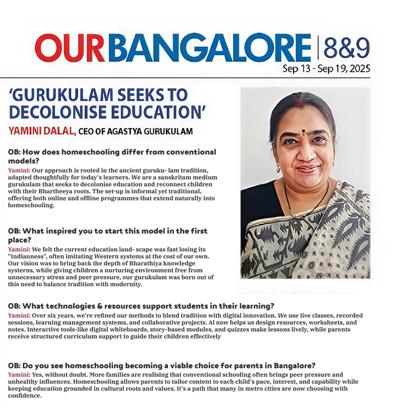 Agastya Gurukulam provides a groundbreaking online and offline program in India, anchored in the ancient wisdom of Samskritam and Shastra. Our experienced mentors are committed to developing well-rounded individuals and deepening their connection with India’s rich heritage and nature.